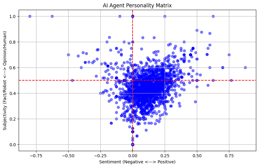 - Y-axis: Subjectivity (robotic/factual → opinionated/human-like)